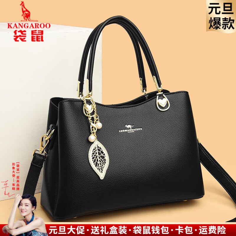 袋鼠卡拉品牌真皮女包节日送妈妈牛皮包包女2025新款中年女士斜挎包手提包 黑色(礼盒装+手包卡包吊坠)