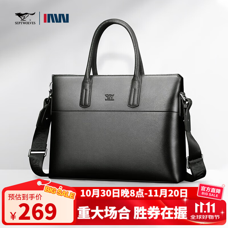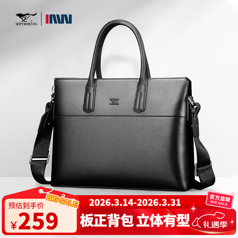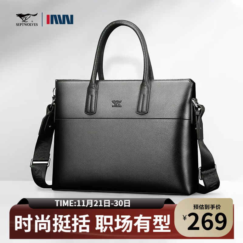 七匹狼公文包男士新商务大容量手提包出差多功能设计单肩包横款电脑皮包 时尚黑色 14英寸