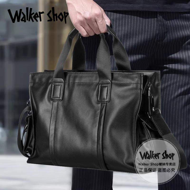 Walker Shop商务公文包手提男优质牛皮牛皮包斜挎包手提包大容量出差电脑包 黑色 大号(40*29*13cm)15.6英寸