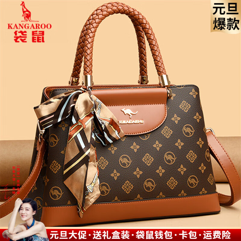 袋鼠卡拉品牌真皮包包女包2025新款大气送妈妈母亲节手提包时尚中年斜挎包 棕色(礼盒装+手包卡包丝巾)
