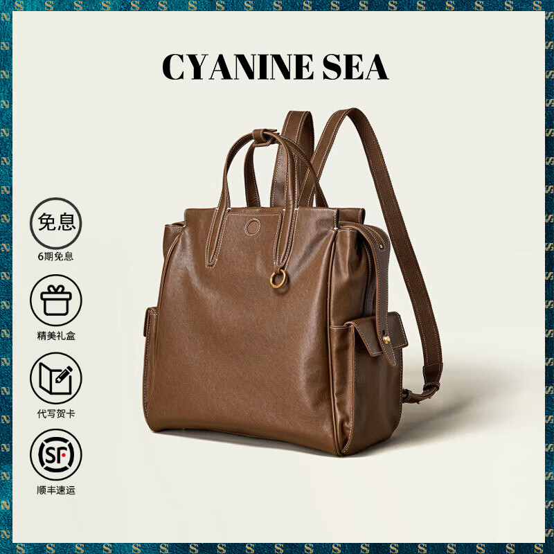 海青蓝 CYANINE SEA轻奢包包女款新款双肩包植鞣牛皮包女士包圣诞生日礼物送女友老婆 檀棕色