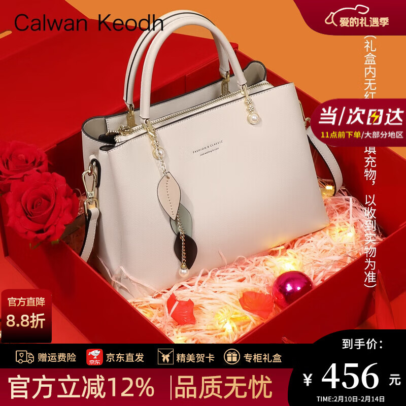 CALWAN KEODH牛皮包包女单肩手提轻奢时尚斜挎妈妈包送生日情人节礼物女朋友 米白色【折叠礼盒】高端品牌实用走心女生闺蜜长辈婆婆