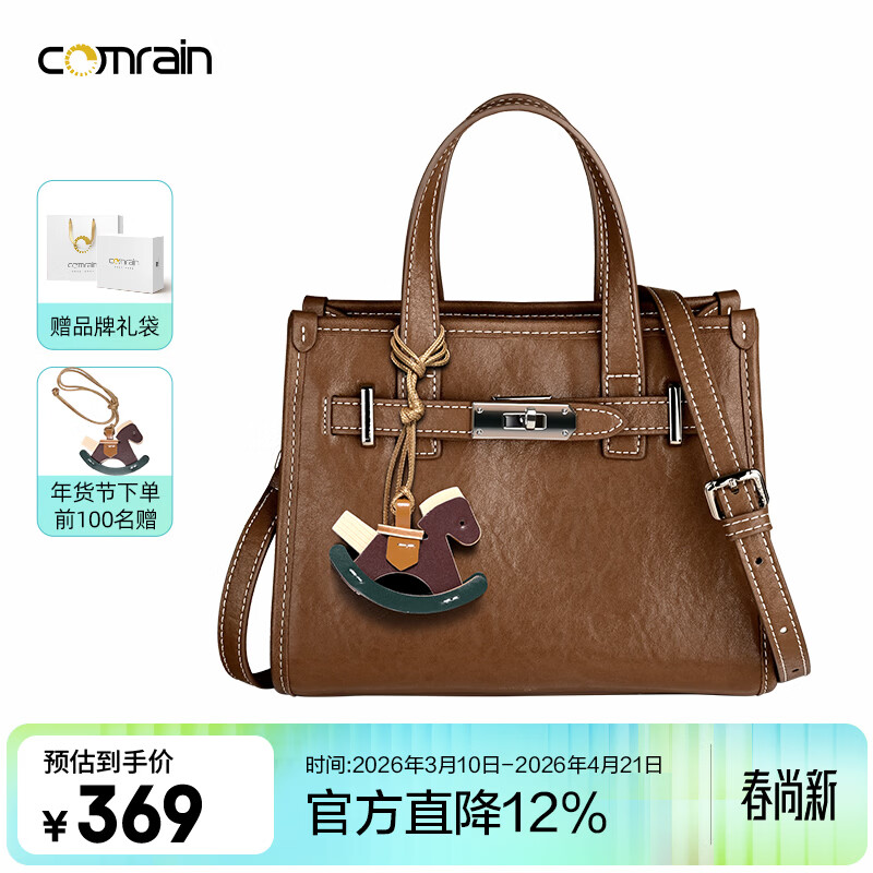 COMRAIN牛皮包包女款新款凯莉包女包通勤单肩斜挎包送老婆生日礼物咖中号