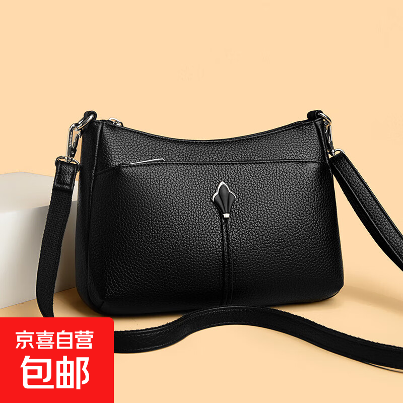 真皮女士包包斜挎包时尚中年妈妈软皮包多层软皮百搭大容量单肩包 黑色