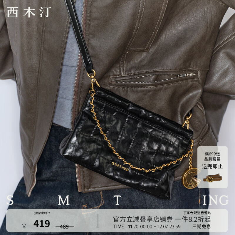 西木汀 可可月光 头层牛皮包包新款链条手提包女斜挎单肩包轻奢 深邃黑