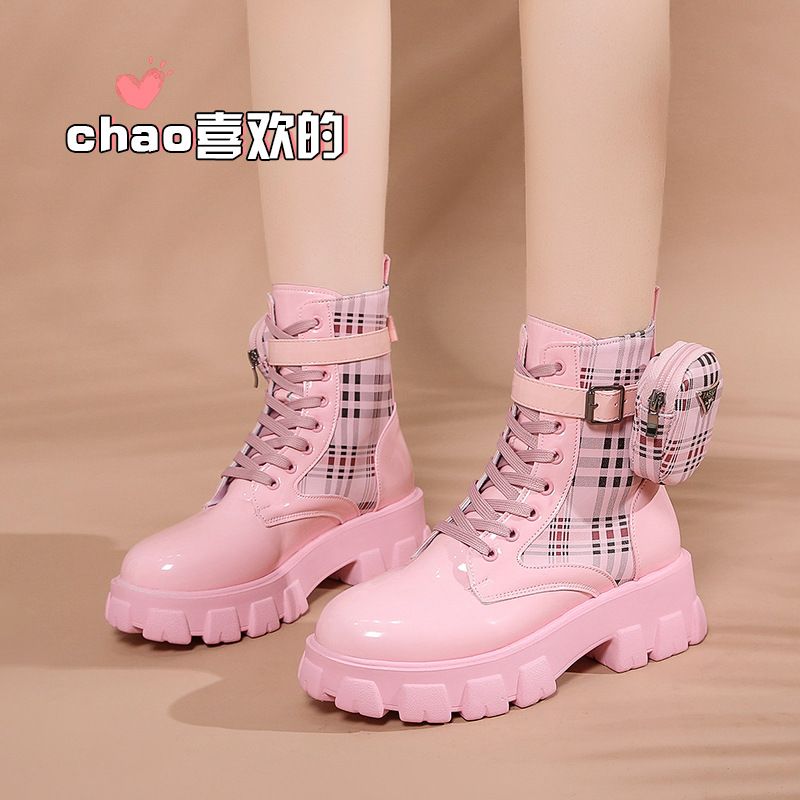 马丁靴女新款欧美大码印花小皮包松糕厚底系带短筒现货女靴子