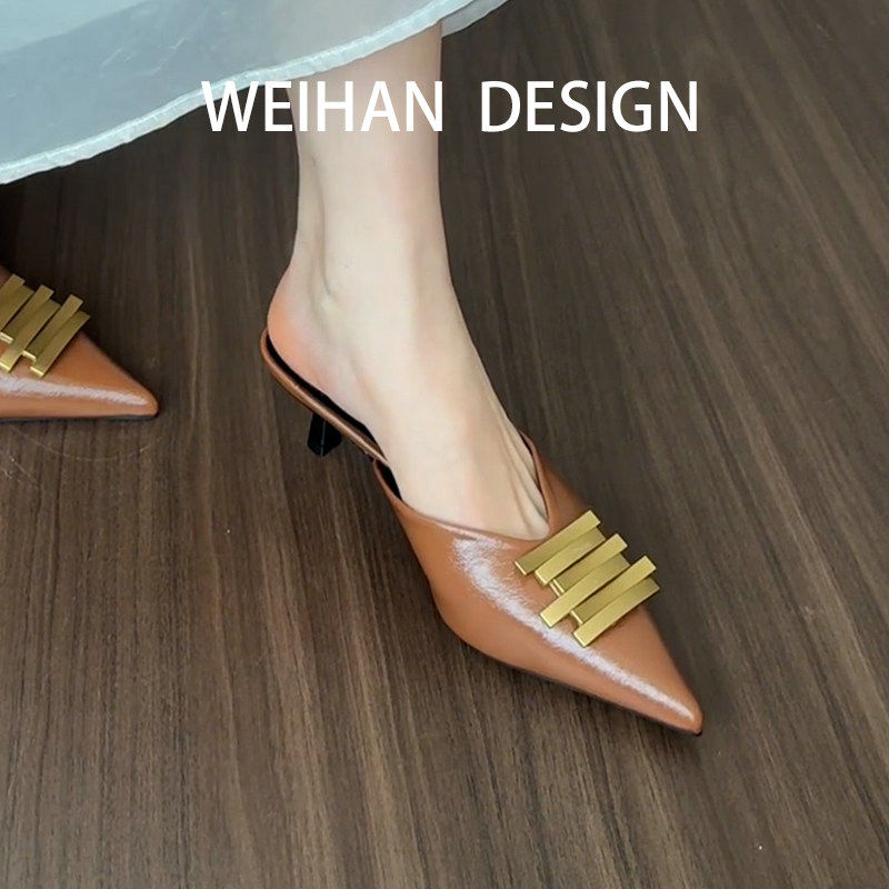 羊皮版!复古金属扣尖头高跟鞋女一脚蹬细跟单鞋百搭真皮包头凉鞋