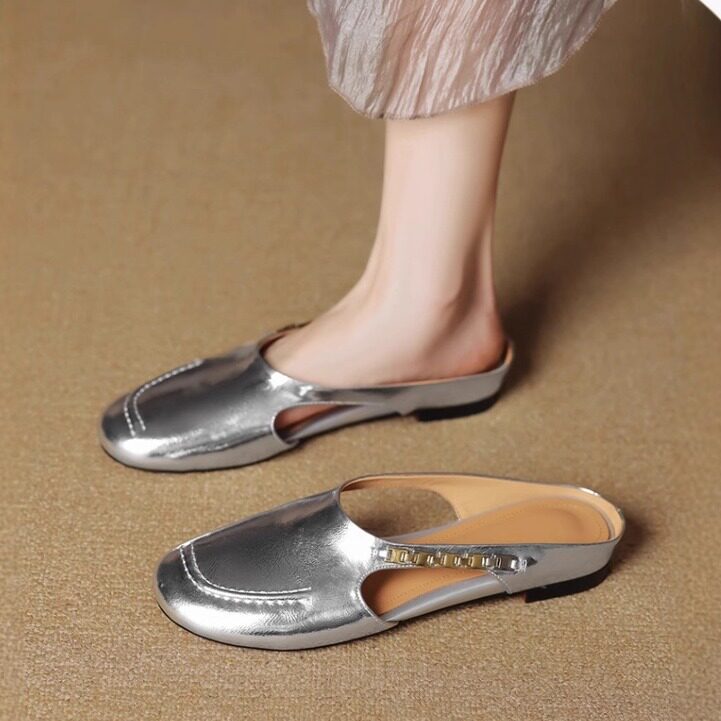 西村名物2026法式复古风真皮包头凉鞋女金属扣一字带低跟百搭女鞋