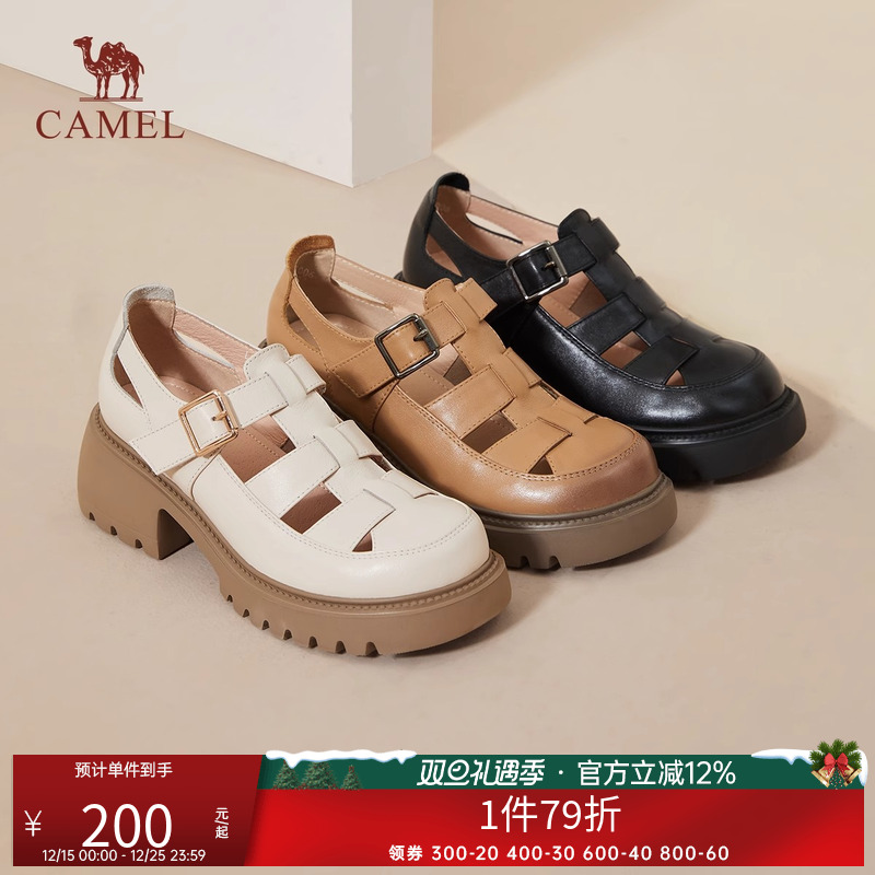 骆驼女鞋夏季新款罗马凉鞋女士真皮包头粗跟厚底镂空猪笼鞋