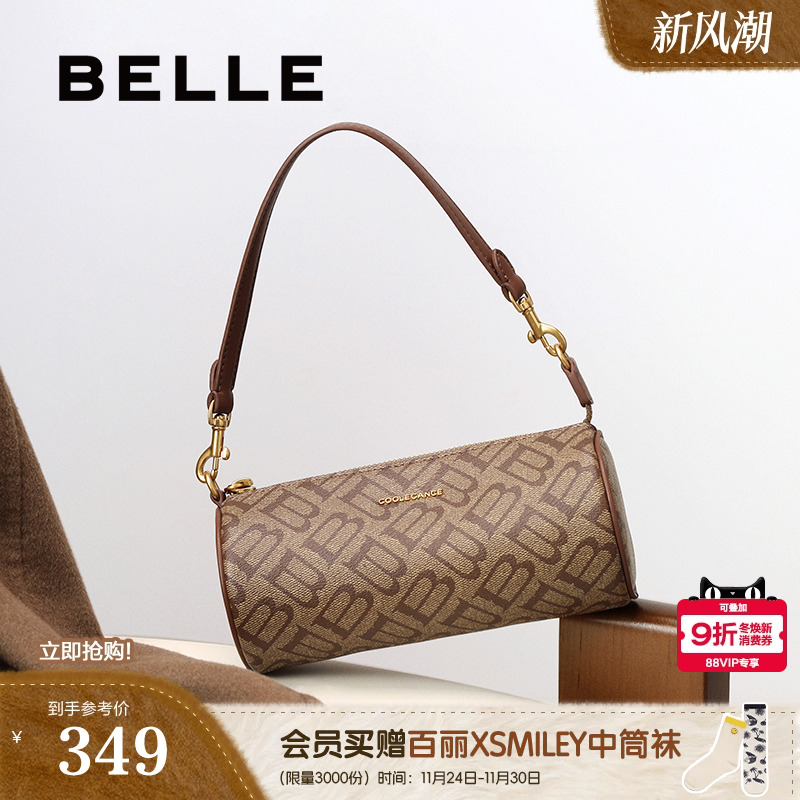 百丽反绒麂皮包包女25新款通勤老花单肩斜挎手拎波士顿包X7396CX5