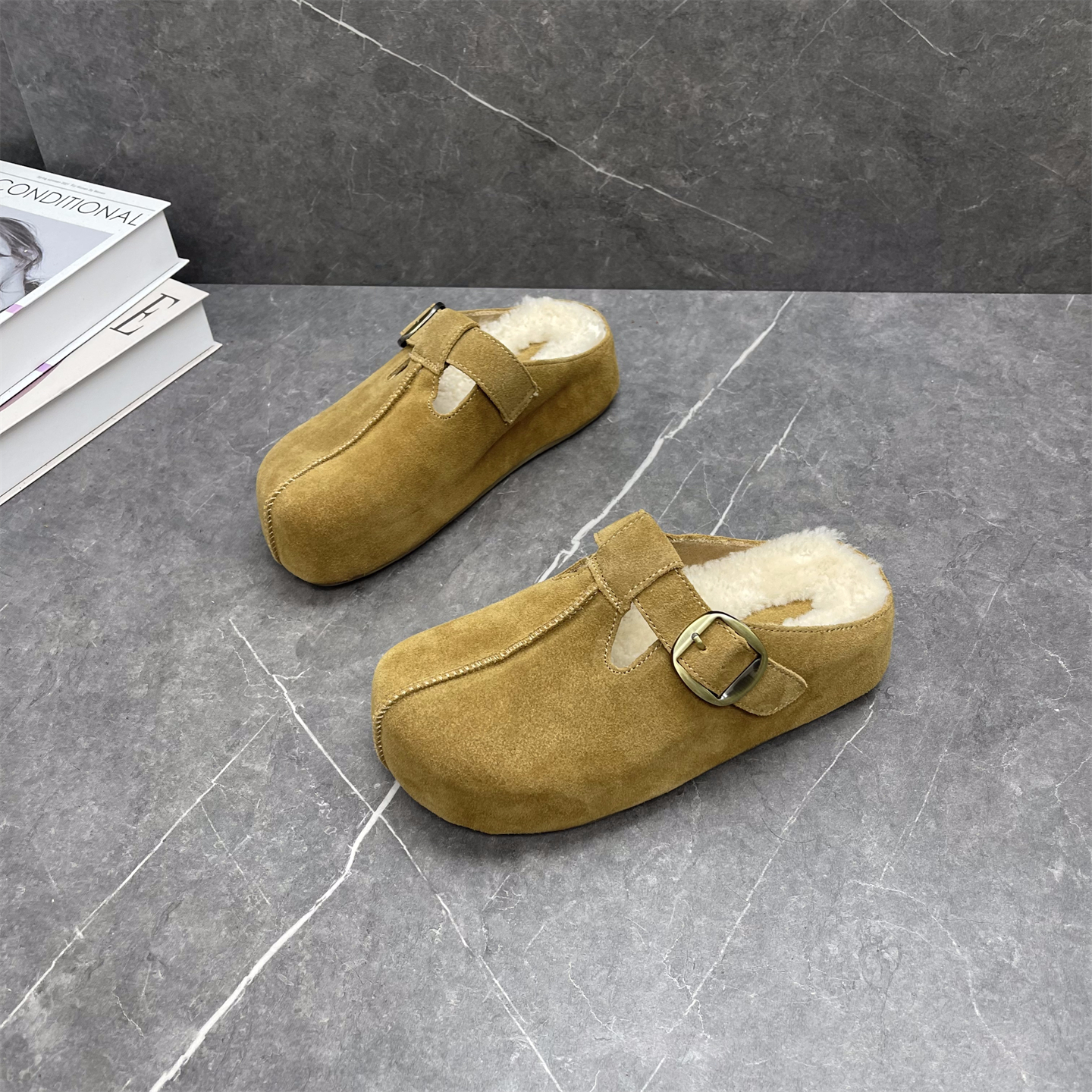 真皮包头丑萌勃肯半拖鞋女2025秋冬季新款皮带扣软底羊毛外穿拖鞋
