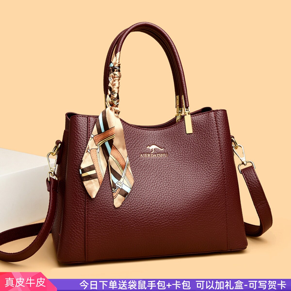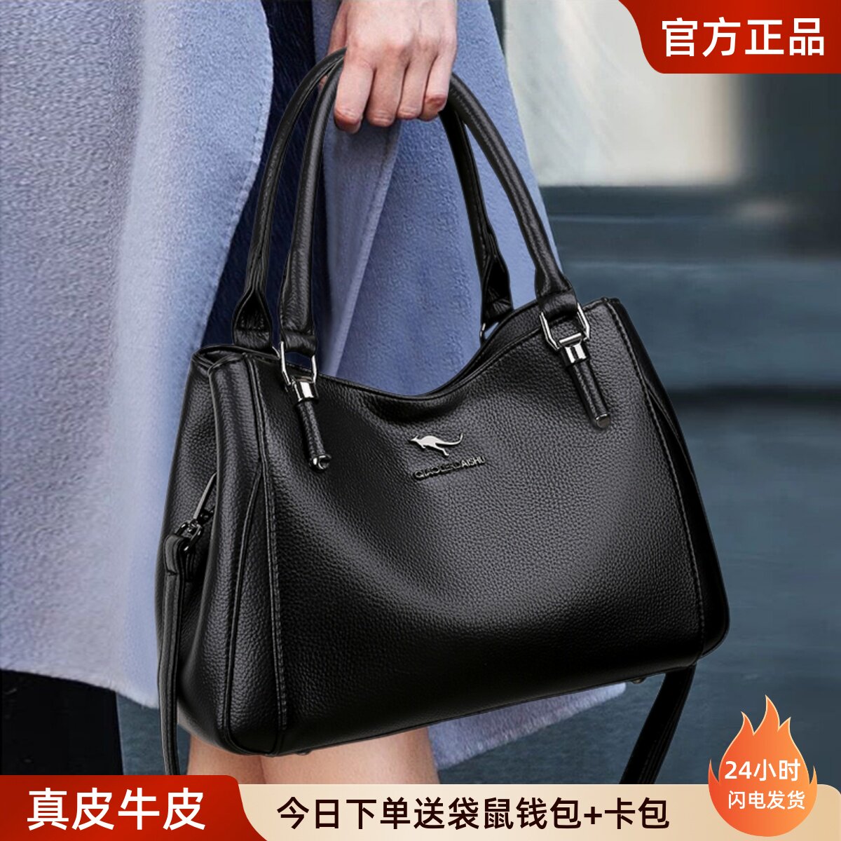 袋鼠真皮女包手提包挎包大包单肩包包女2025新款大容量妈妈牛皮包