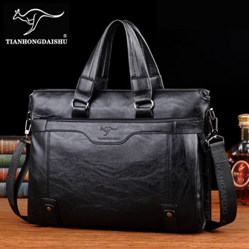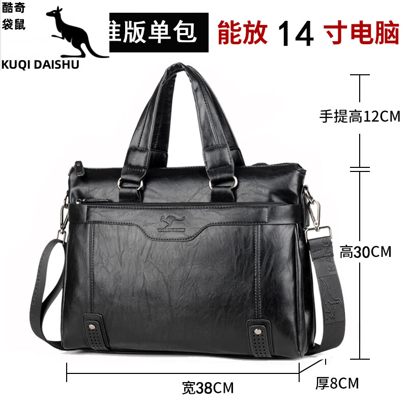 酷奇袋鼠(KUQIDAISHU)公文包大容量真皮男士手提包包包商务牛皮男包斜挎包皮包旅行背包 小号黑色 默认规格1