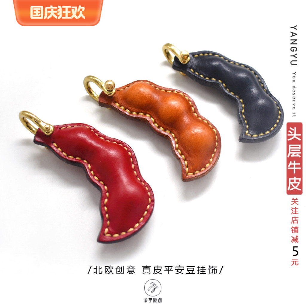真皮『平安豆』双面车钥匙扣手工牛皮包挂饰汽车挂件手账书签礼物