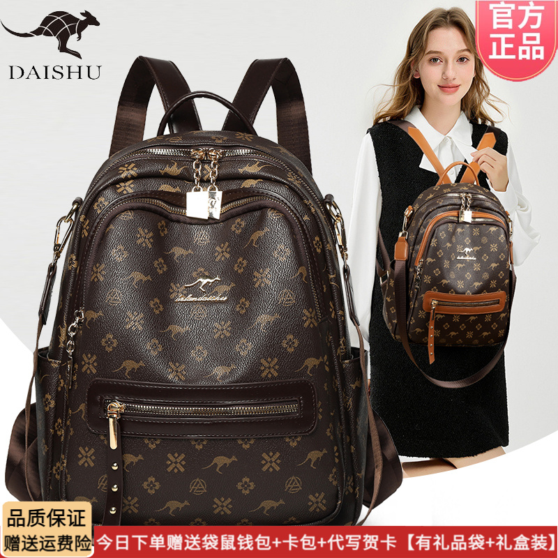 正品袋鼠双肩包女皮包2025秋季新款大容量旅行轻便背包软皮送妈妈