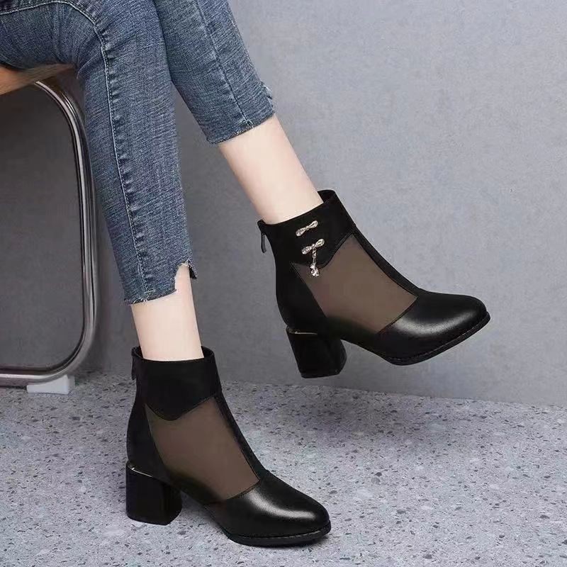 气质款真皮包头凉鞋女夏季中跟皮鞋网纱2025新款旅游显瘦网面凉