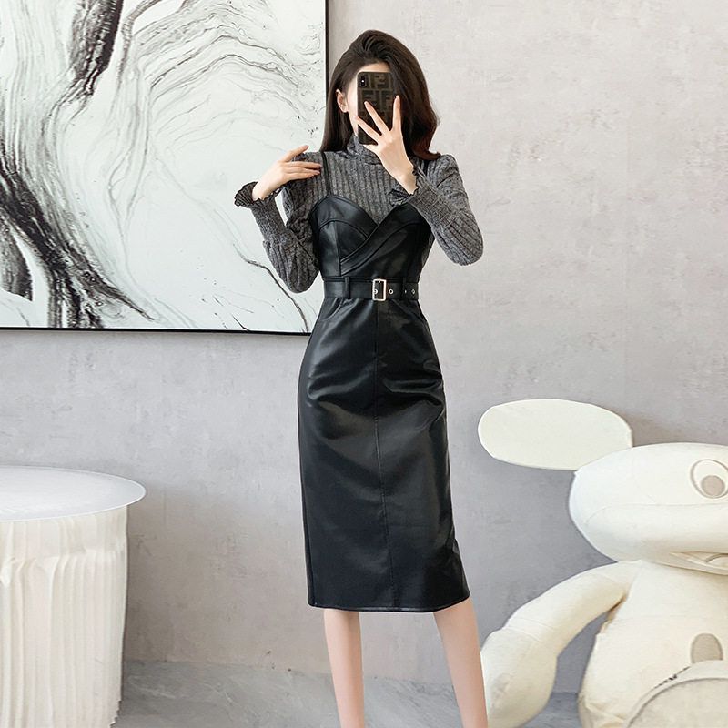 裙子打底衫PU新款两外贸女装皮包臀套装+长袖实拍吊带针织连衣裙