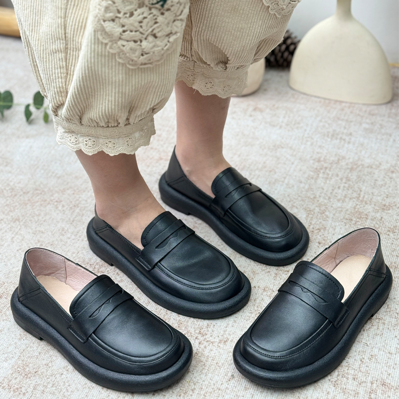 真皮包鞋女皮鞋软底一脚蹬中年妈妈女鞋乐福鞋牛皮工作鞋黑色宽头