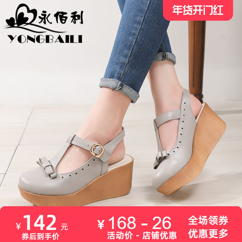 真皮包头半拖鞋女外穿增高7cm夏季新款搭扣松糕厚底凉拖鞋勃肯鞋