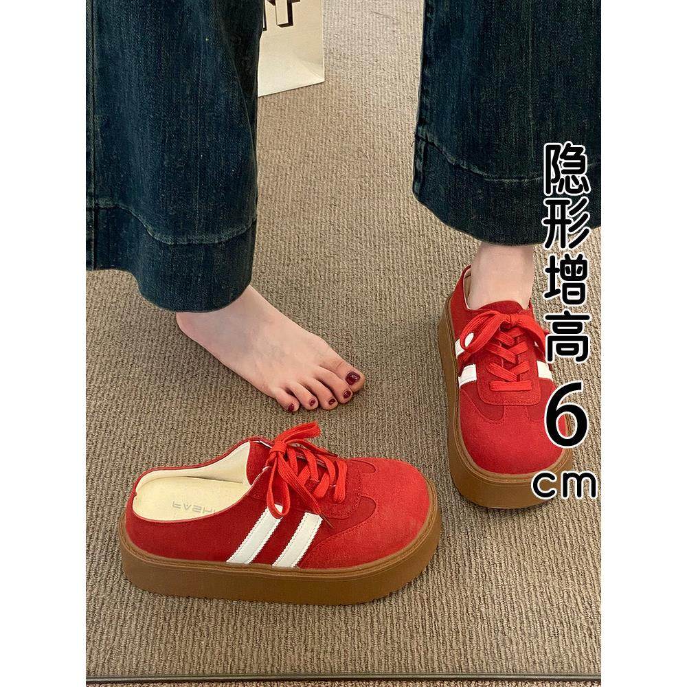 英国真皮包头半拖鞋女秋季2025新款一脚蹬厚底增高单鞋红色德训鞋