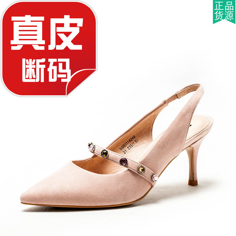 真皮包头凉鞋女尖头高跟粉色羊皮玛丽鞋子一字细带水钻SS91114249