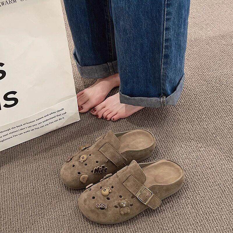 英国真皮包头拖鞋女夏季外穿2025新款厚底半包勃肯鞋洞洞半拖鞋子