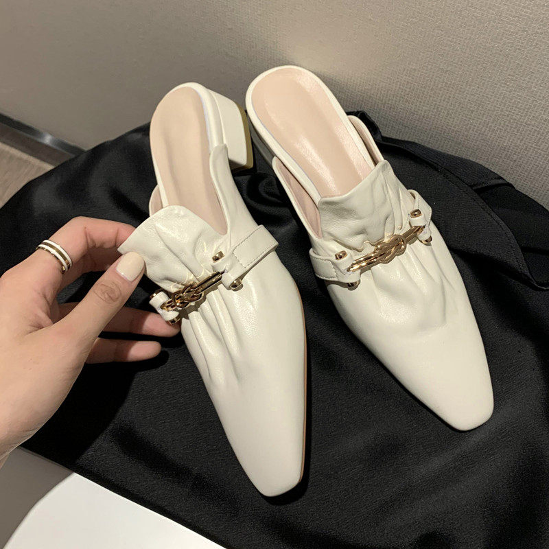 韩式真皮包头拖鞋女外穿粗跟金属扣方头穆勒鞋一脚蹬米白色百搭夏