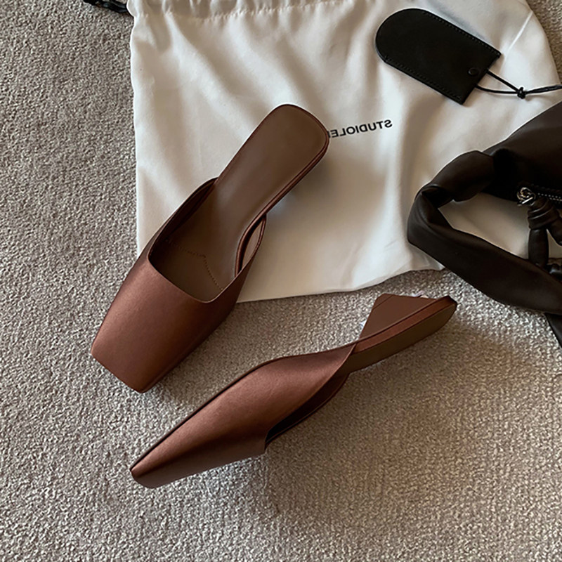 羊皮版~简约高级感真皮包头半拖鞋女法式方头缎面三角跟穆勒凉拖