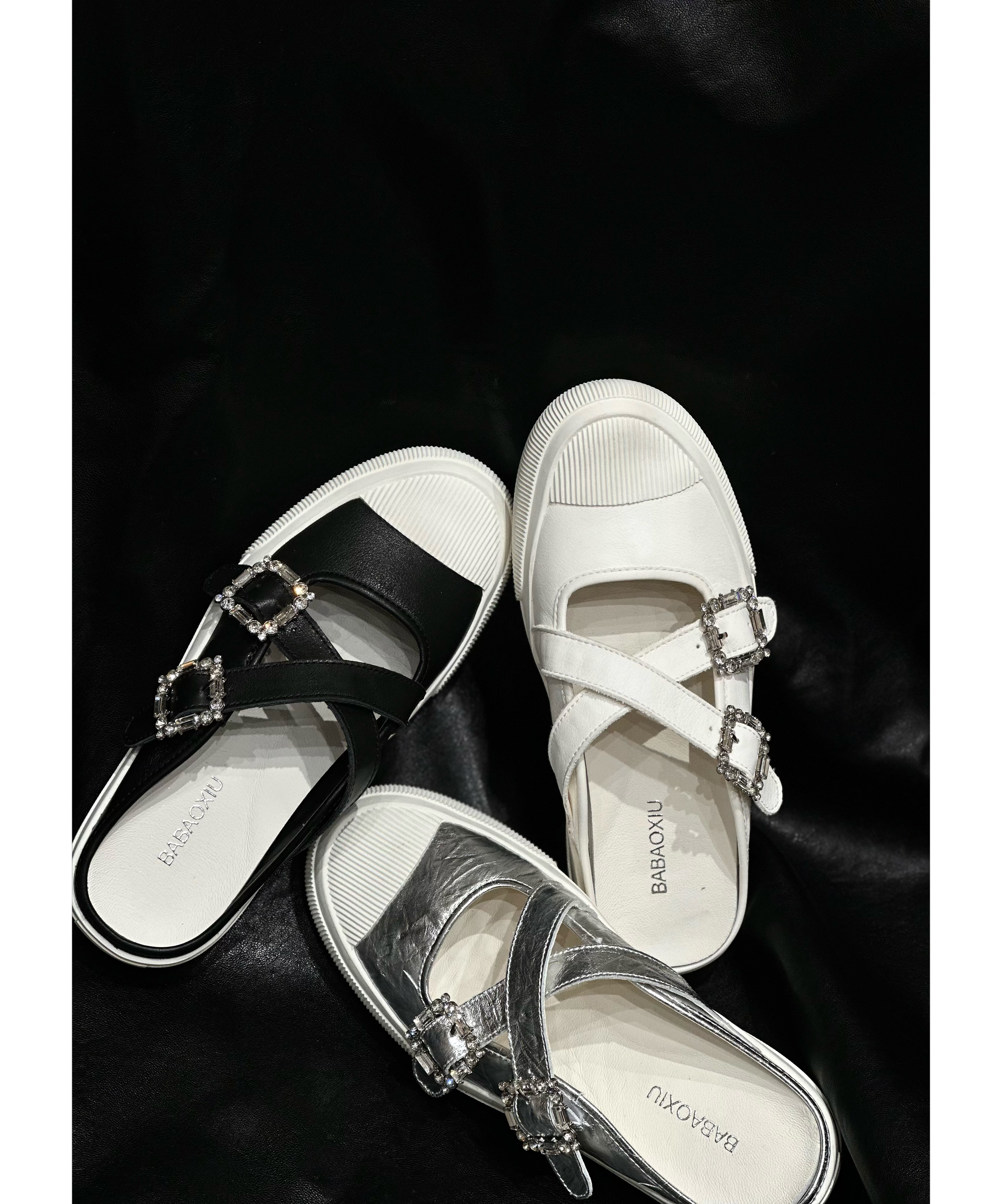 真皮包头凉拖鞋子外穿女春夏尖头平跟银色牛皮水钻花饰SS81110126