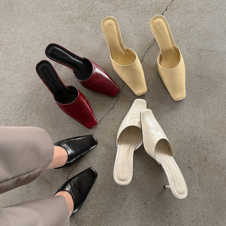 欧版气质小方头真皮包头凉拖 5cm细高跟时装拖鞋女压花牛漆皮凉鞋