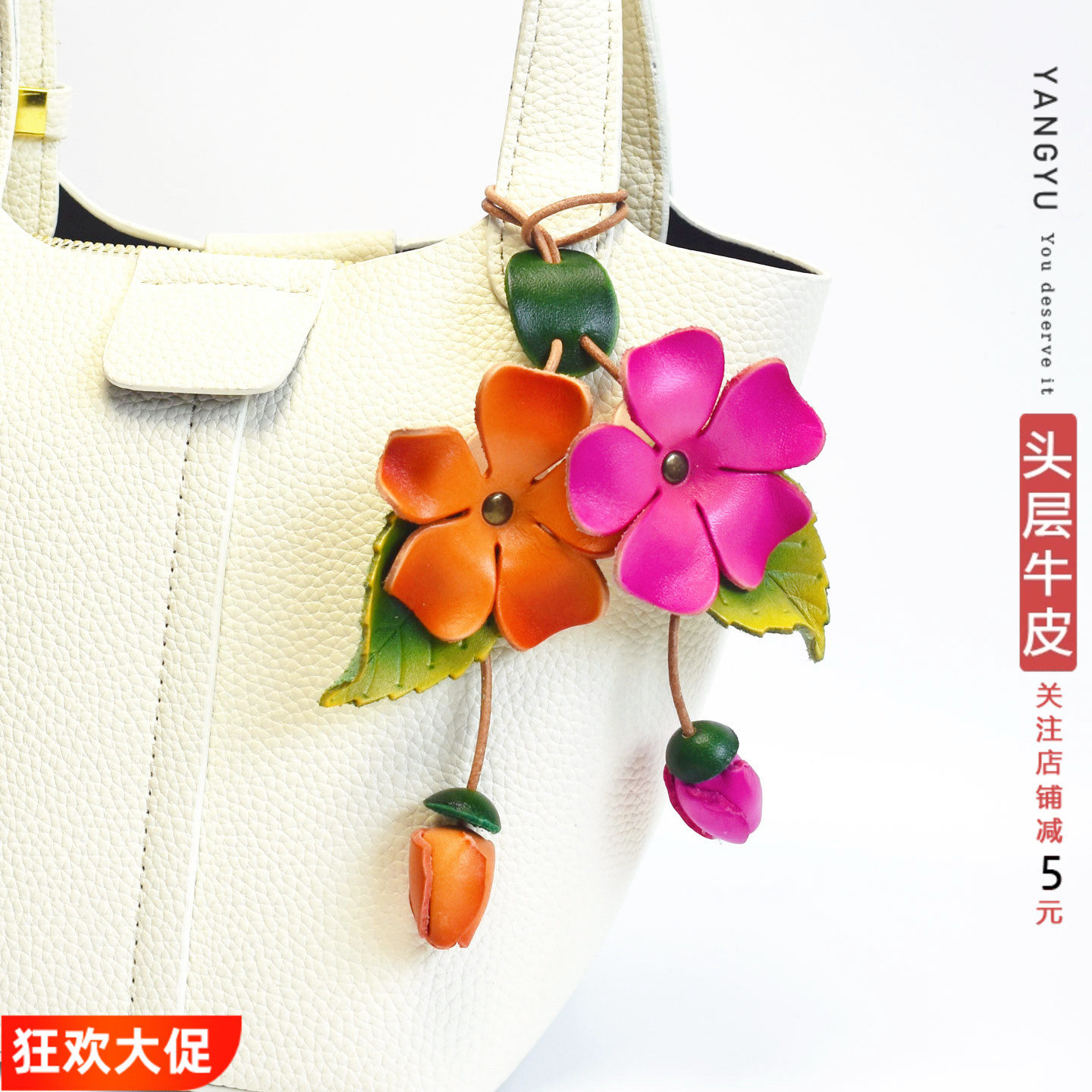 洋芋【悦然之花】真皮包挂件头层牛皮花朵挂饰吊坠水桶托特包通用