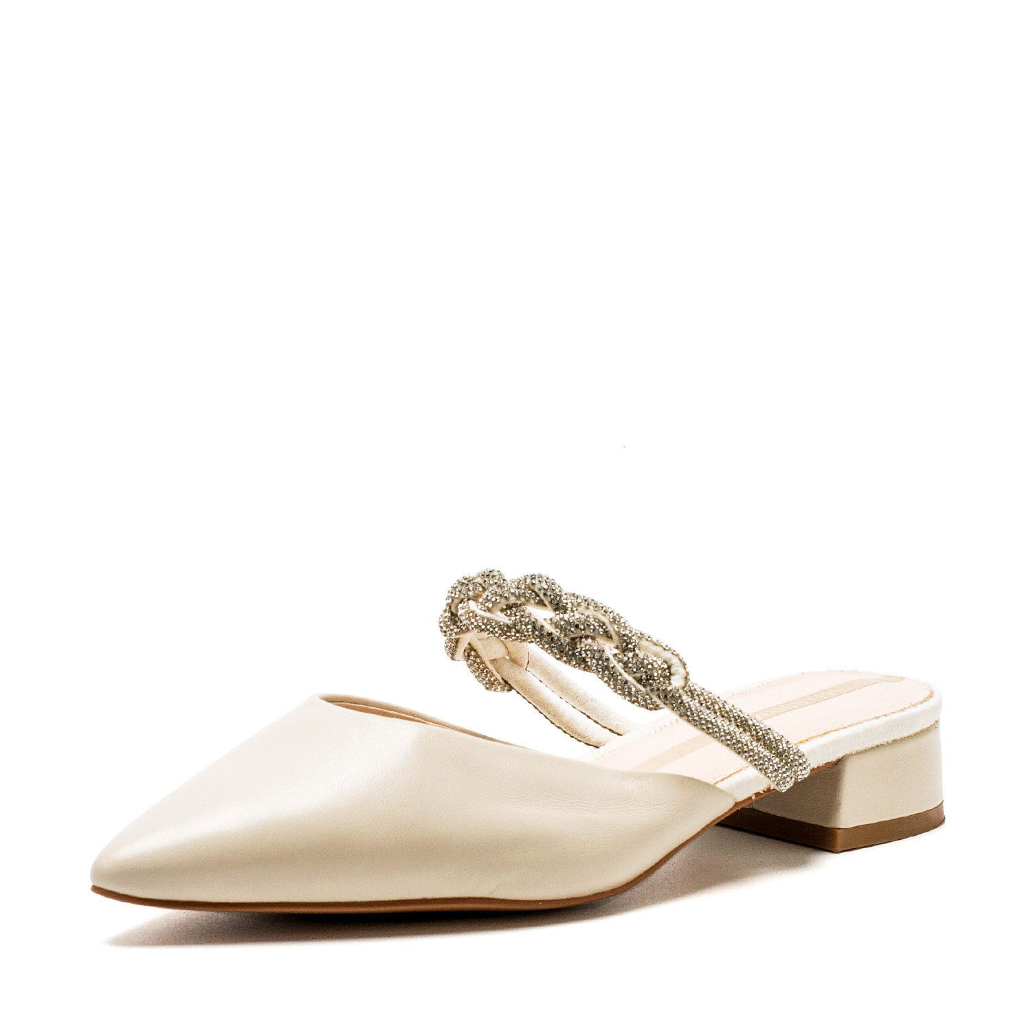 真皮包头凉拖鞋子女米白色羊皮尖头低粗跟后空套脚水钻MD21114D15