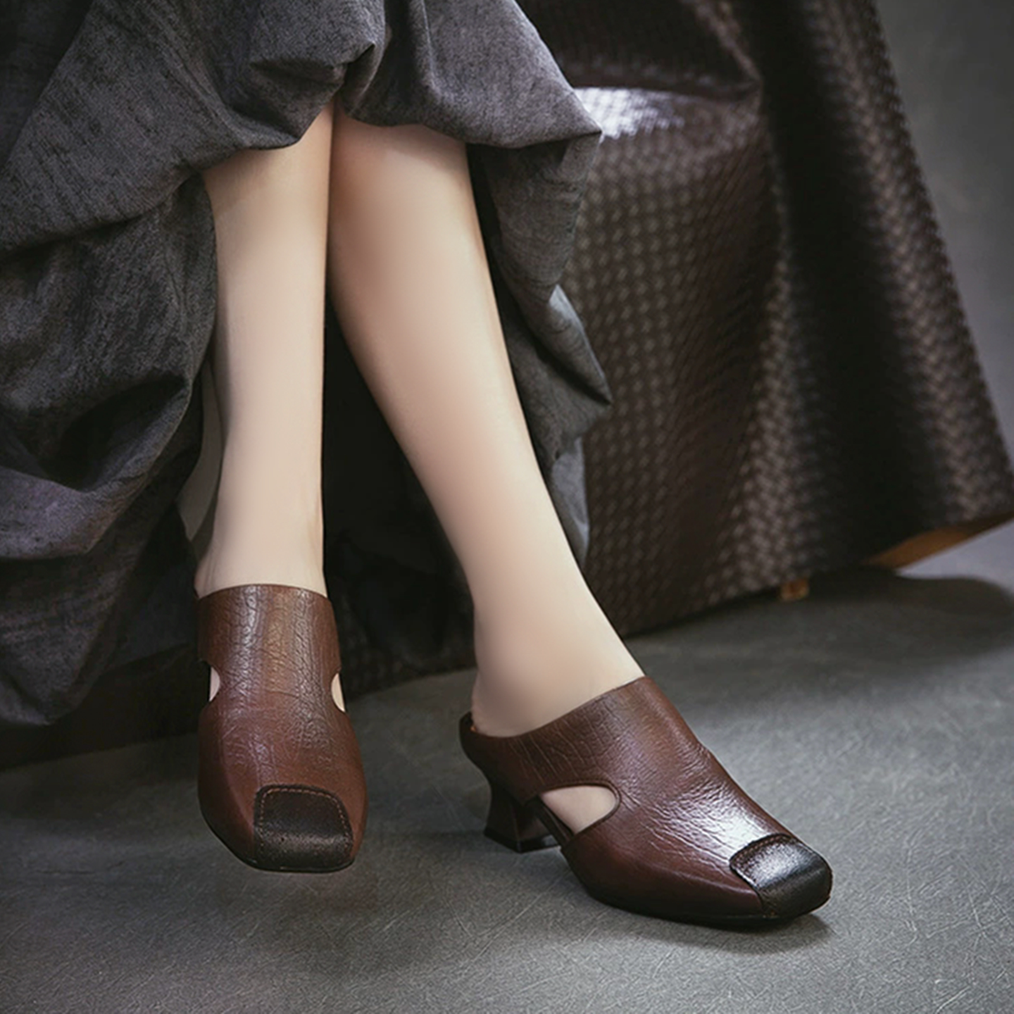 复古风真皮包头凉拖鞋女粗跟方头时尚百搭一脚蹬设计感半拖鞋女
