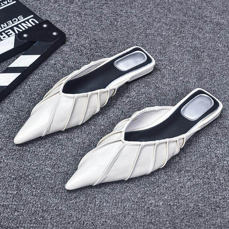 法式真皮包头尖头半拖鞋女外穿2025夏新款春秋穆勒鞋网红平底凉拖