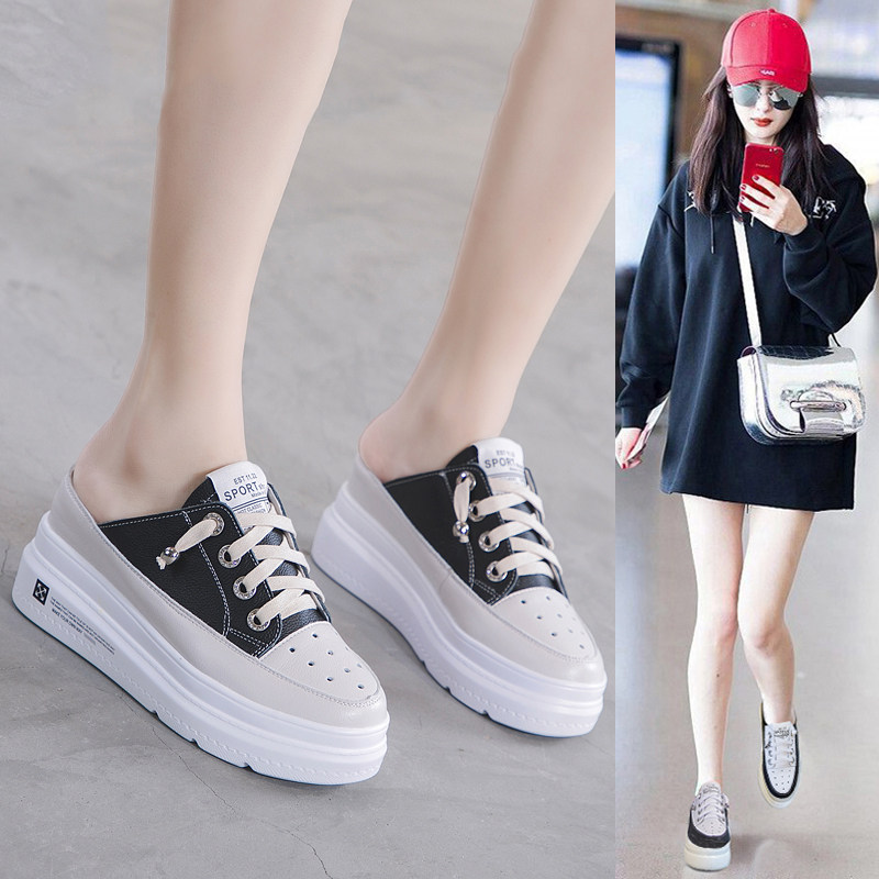 真皮包头增高半拖鞋女夏新款厚底松糕休闲小白鞋时尚懒人外穿凉拖