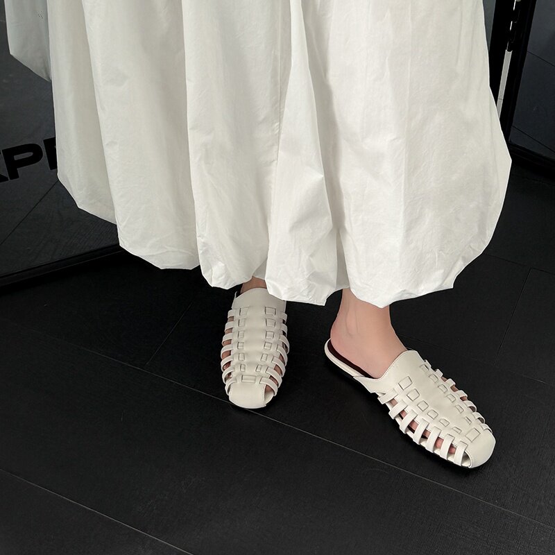 2026新品~真皮包头拖鞋女编织带夏季透气圆头一脚蹬外穿拖鞋米白