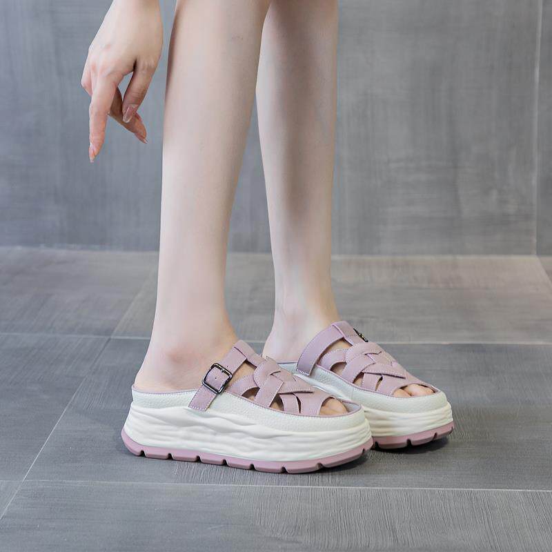真皮包头厚底半拖鞋女外穿春夏网红松糕小白鞋镂空透气内增高凉拖