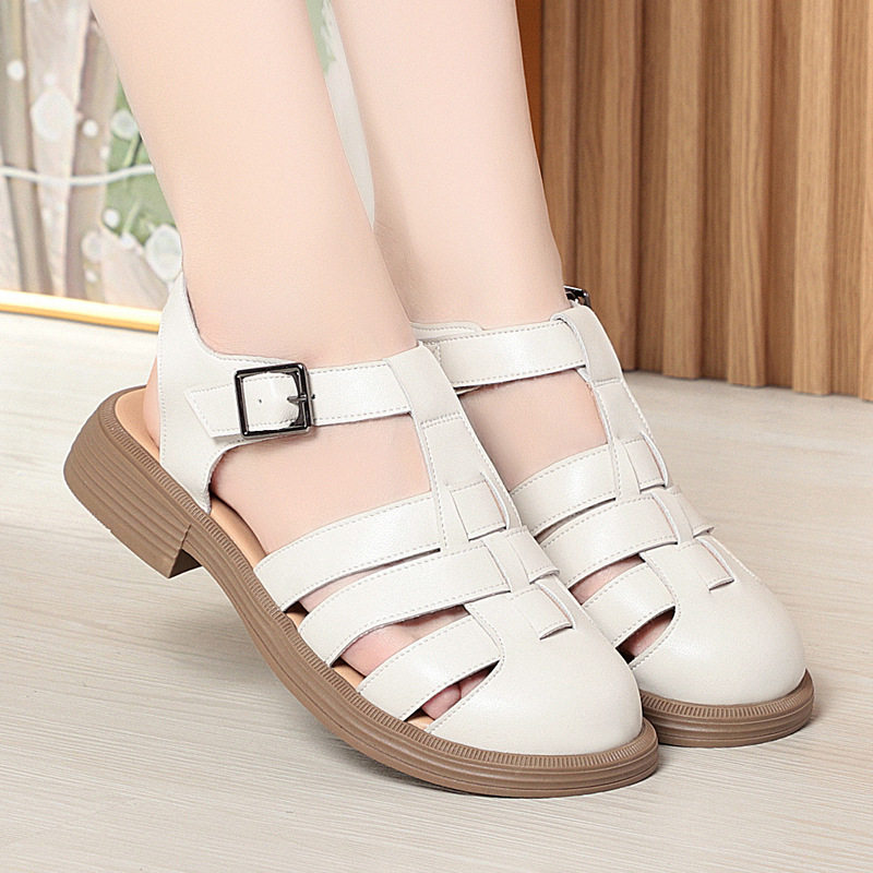 撤柜夏季一字带镂空真皮包头凉鞋女粗跟软底浅口百搭妈妈鞋大码平