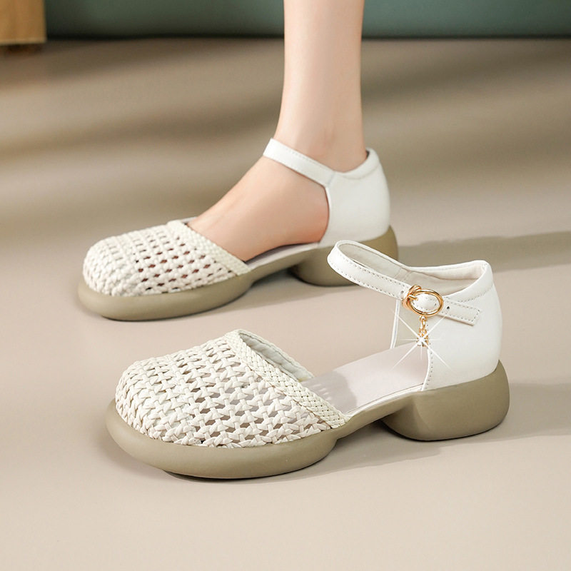 撤柜真皮包头凉鞋女新款厚底夏季平底镂空猪笼鞋复古小皮鞋夏