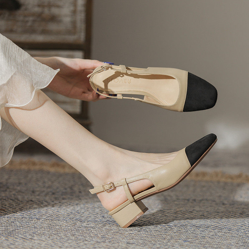 店主自留新款~真皮包头低跟粗跟凉鞋女2025夏季方头后空中跟单鞋