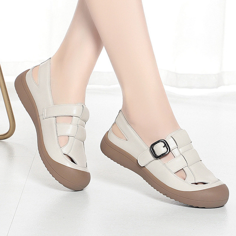 撤柜真皮包头凉鞋女平底夏季新款软底镂空舒适中老年妈妈洞洞女鞋