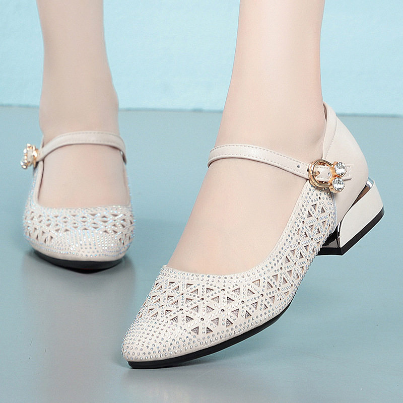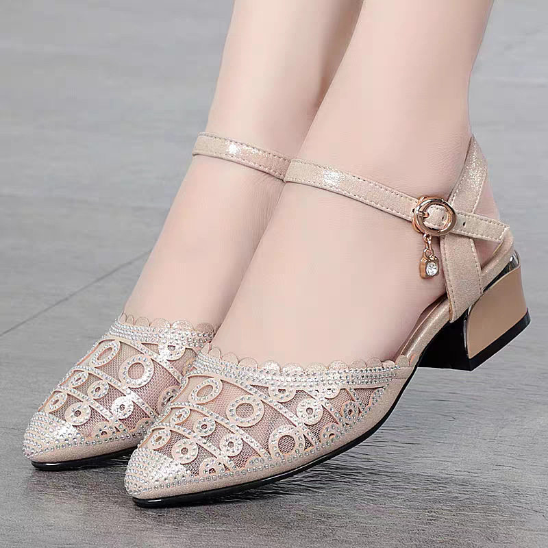 撤柜真皮包头网纱凉鞋女夏季镂空网面单鞋粗跟女鞋软底透气妈妈鞋