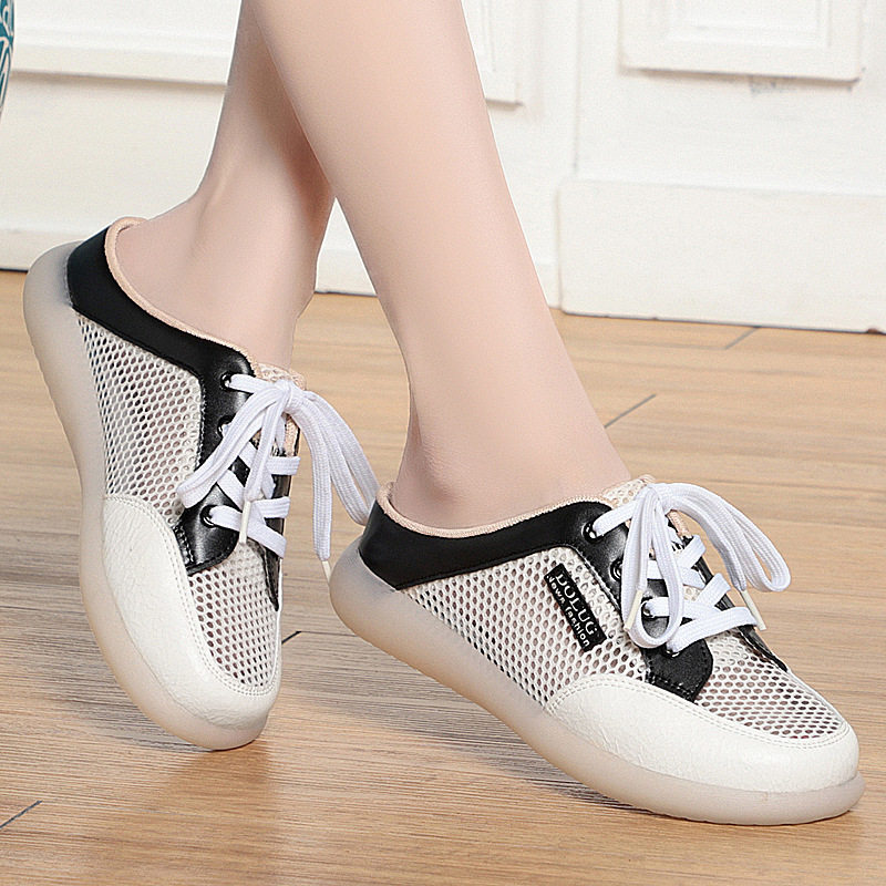 撤柜真皮包头半拖鞋女外穿新款夏季牛筋软底妈妈鞋网面透气小白鞋