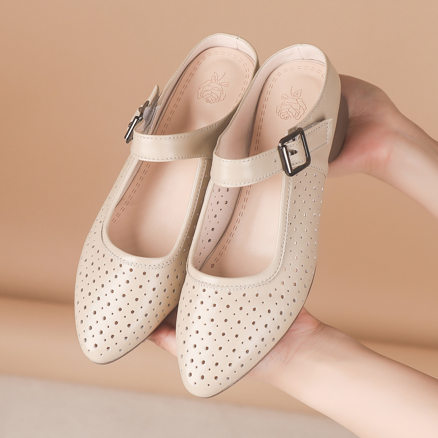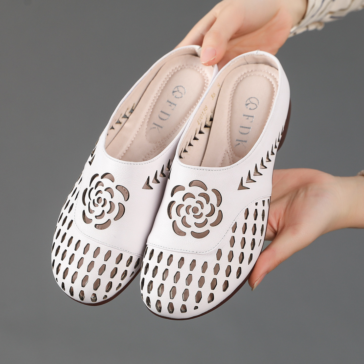 真皮包头半拖鞋女夏季外穿镂空洞洞凉拖一脚蹬懒人鞋透气妈妈拖鞋