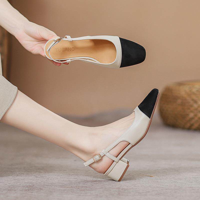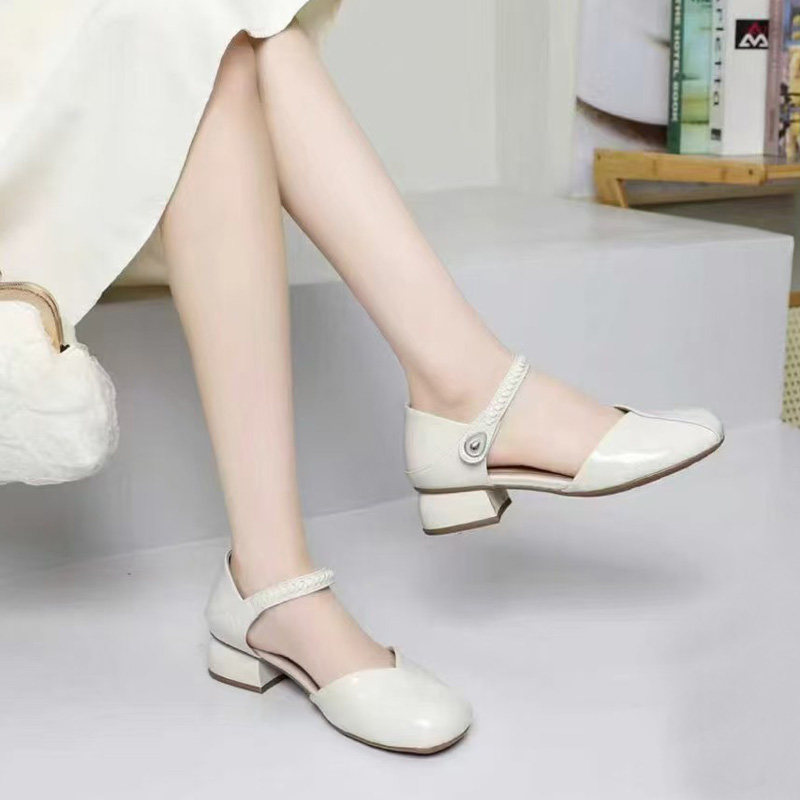 港风轻奢新款~真皮包头凉鞋女2024夏季法式方头中跟粗跟高跟单鞋