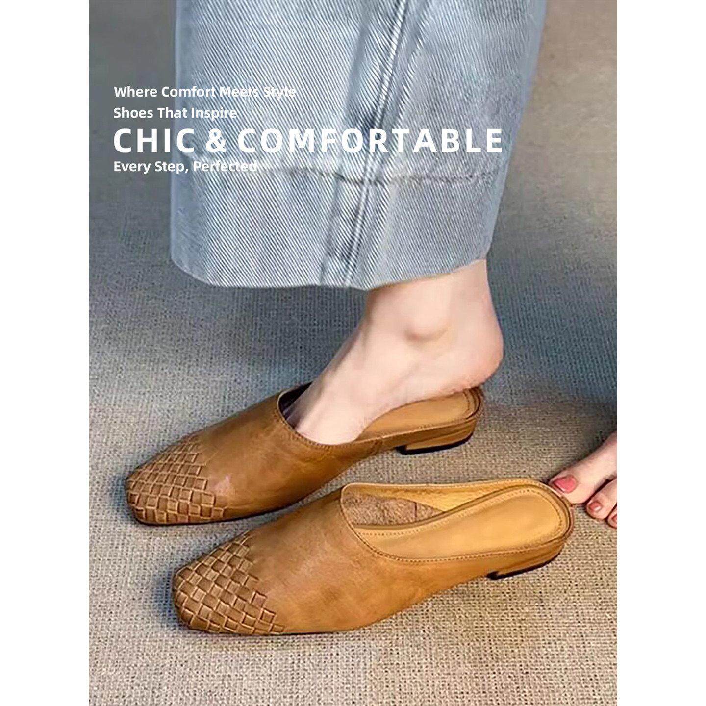 叁里编织真皮包头半拖鞋女2026夏新款舒适百搭一脚蹬方头粗跟凉拖