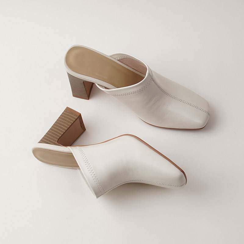 小克拉夏季新款懒人穆勒鞋真皮包头半拖鞋女外穿高跟鞋8cm粗跟白