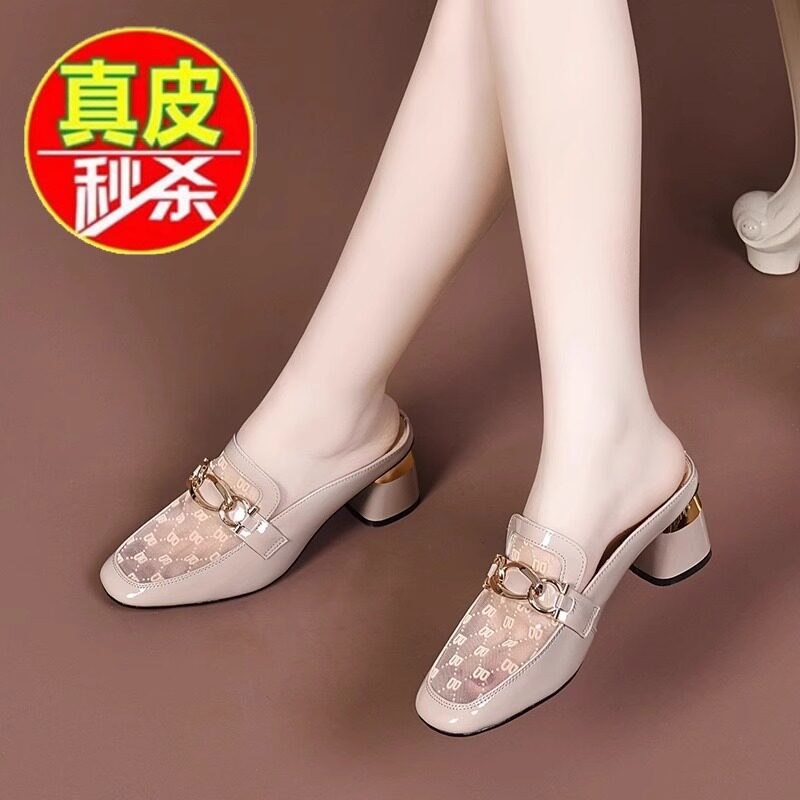 品牌鞋断码特价真皮包头半拖鞋女夏季外穿网纱镂空气质粗跟凉鞋女