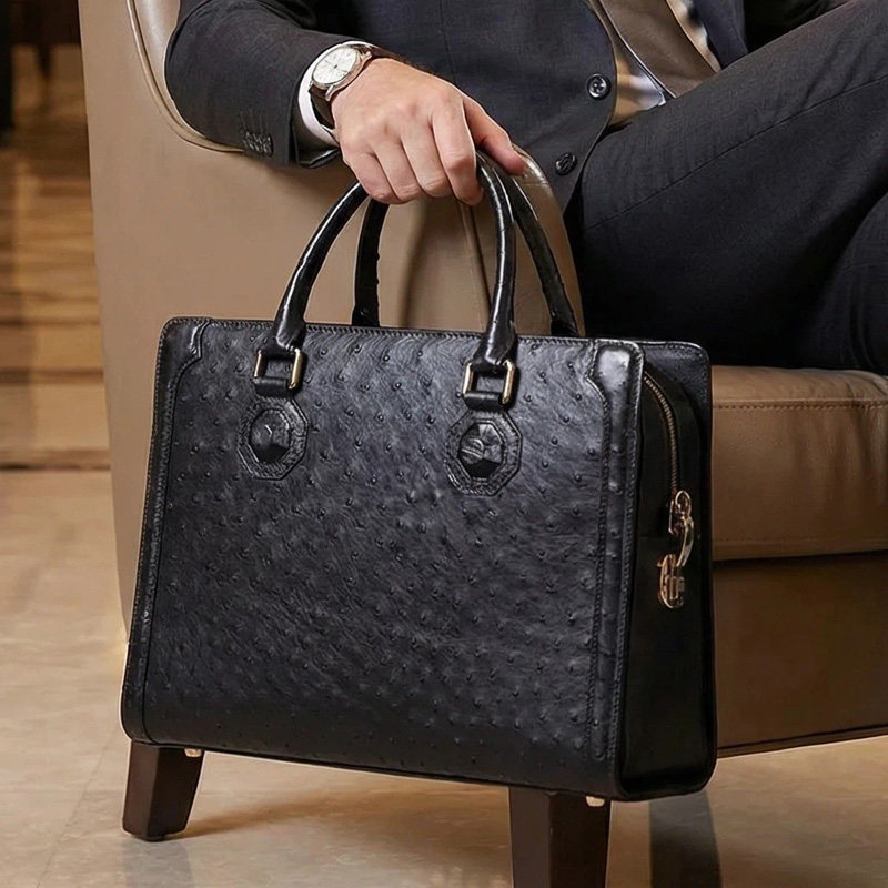 鸵鸟皮男士手提包商务男包真皮大容量新款皮包密码锁单肩黑公文包