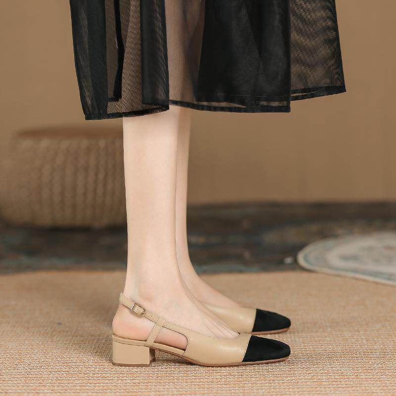 轻奢自留2024新款~真皮包头低跟凉鞋女夏拼色粗跟浅口后空高跟鞋